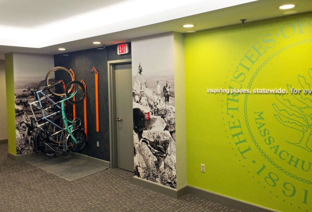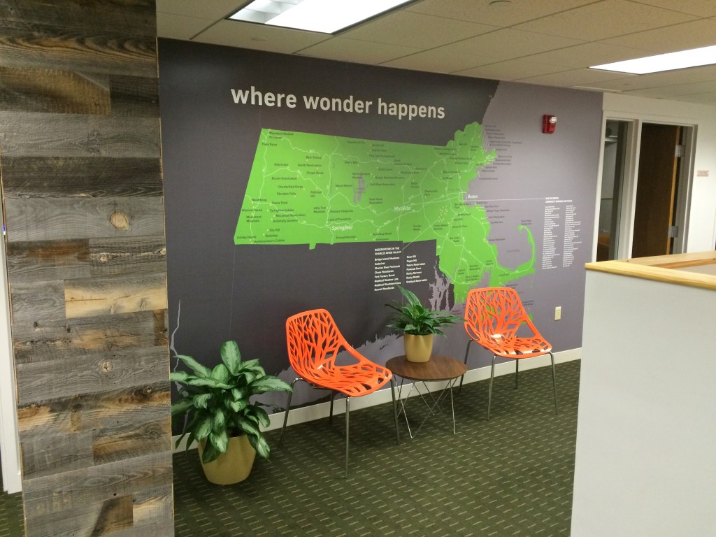 As The Trustees consolidated offices and moved to a more centralized model for certain functions, it became critical to have a vibrant, welcoming space that reflected their 120+ properties across Massachusetts. The aesthetic was intended to reflect the newly refreshed brand: an energetic, forward-thinking organization, with a history and mission largely focused on nature and conservation.